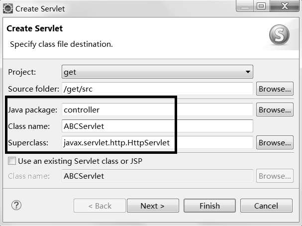 说明1:通常Servlet程序负责“扮演”控制器(Controller)的角色,在Java package文本框处输入controller,指该package存放的是Servlet程序(有关控制器的更多知识参考第8章内容)。