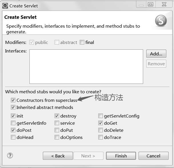 (3)单击Next按钮,进入创建Servlet程序的界面,选择创建构造方法、init、destroy、doGet和doPost方法,单击Finish按钮,即可创建ABCServlet程序,如图2-10所示。