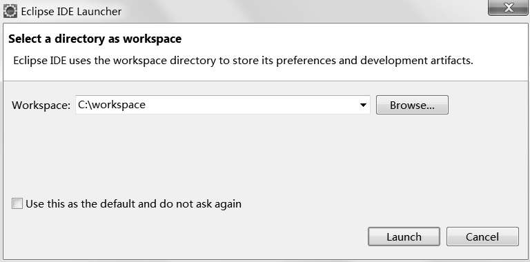 成功启动Eclipse后,Eclipse会提示选择工作空间(Workspace),如图2-3所示。将工作空间修改为C:\workspace,单击Launch按钮,即可看到Eclipse欢迎界面。