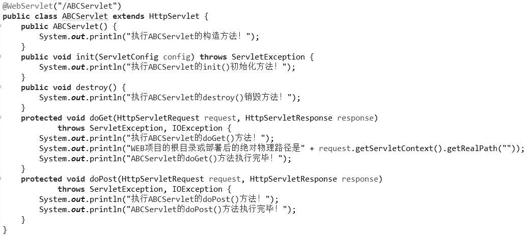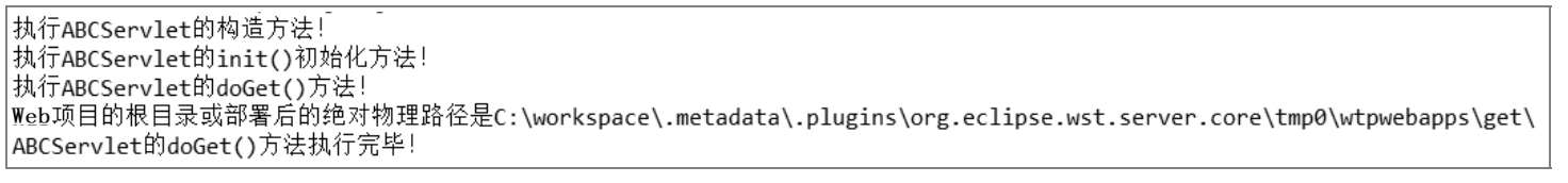 第一次执行ABCServlet程序时,会依次触发ABCServlet程序的构造方法、init()方法、doGet()方法执行。以后再执行ABCServlet程序时,会触发doGet()方法执行,但构造方法和init()方法将不再执行。