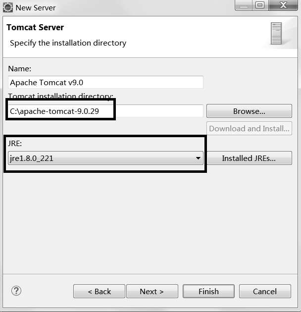 图2-12 选择Tomcat安装目录和JRE