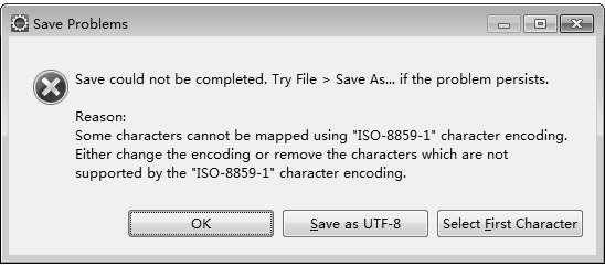 (3)保存JSP程序,将出现图2-18所示的错误提示窗口。关闭错误提示窗口,修改abc.jsp的代码,将代码pageEncoding="ISO-8859-1"修改为pageEncoding="UTF-8",再次尝试是否可以成功保存JSP程序。