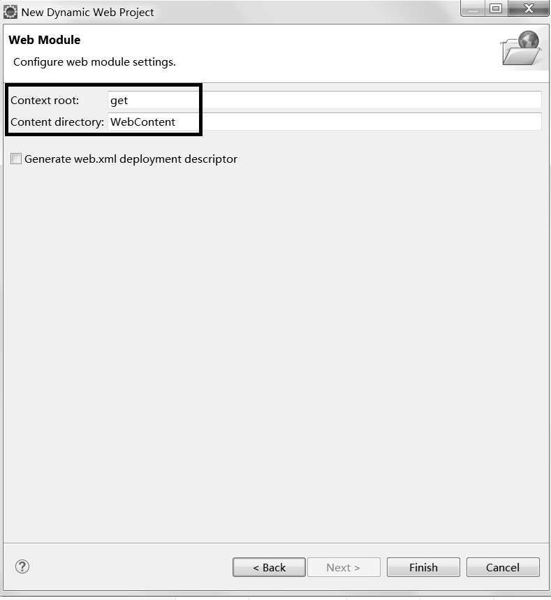 说明1:使用Eclipse创建Web项目时,Context root配置了Web项目的虚拟路径。在默认情况下,Web项目虚拟路径名就是Web项目名(这里是get)。Web项目虚拟路径“指向了”Web项目部署后的绝对物理路径。由于还没有将get项目部署到Tomcat中,目前还无法得知get项目部署后的绝对物理路径。