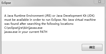 启动Eclipse时,可能出现图2-1所示的错误提示,这是因为启动Eclipse时需要使用javaw.exe(javaw.exe主要用于基于GUI的应用程序),但是Eclipse找不到javaw.exe,通过下列的操作可排除该错误。如果没有出现此错误提示,我们可以跳过这些操作。