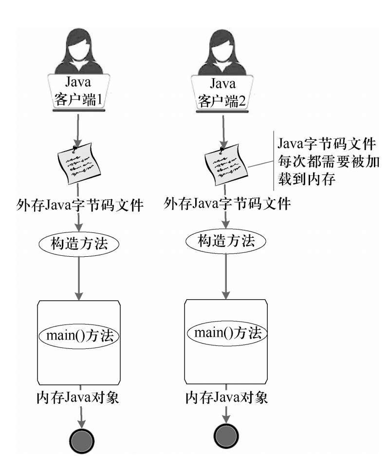 运行“传统”Java程序时,Java虚拟机将Java类的字节码文件加载到内存,然后调用构造方法实例化一个Java对象,接着运行对象的main()方法。main()方法运行结束后,内存中的对象被清除。下次再运行该Java程序时,重复上述步骤。传统Java程序的生命周期如图2-16所示。