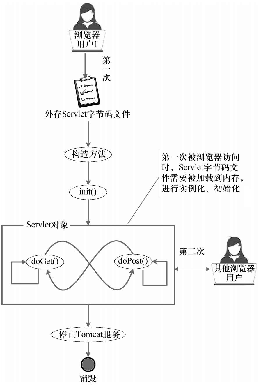在浏览器用户1访问Servlet程序时,Servlet字节码文件将被加载到Tomcat服务器内存,Tomcat先调用构造方法实例化Servlet对象,然后调用init()方法初始化该Servlet对象,接着调用doGet()或者doPost()方法,服务第一个浏览器用户。