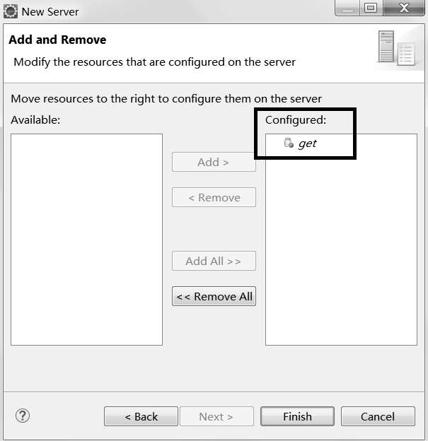 (3)单击Next按钮,进入将项目部署到Eclipse中的Tomcat界面,如图2-13所示。选择要部署的项目get→单击Add按钮→单击Finish按钮。