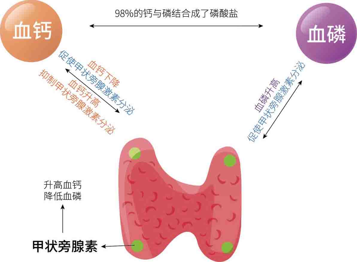 正常人血浆中甲状旁腺素的浓度约为0.8μg/L,其主要的生理作用是升高血钙,降低血磷。血钙和血磷的浓度又通过反馈机制,影响甲状旁腺激素的分泌。如果将甲状旁腺摘除,可引起严重的低血钙。当血钙下降时,会促使甲状旁腺激素分泌;当血钙升高时,会抑制甲状旁腺激素分泌;当血磷升高时,也会促使甲状旁腺激素分泌。于是钙、磷和甲状旁腺激素就构成了“相爱相杀”的复杂关系三角。