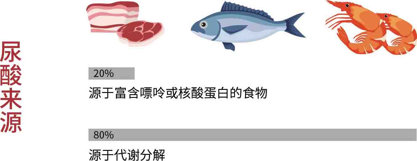 尿酸是人体内嘌呤代谢的终末产物。人体内80%的尿酸是由细胞核的蛋白质分解代谢产生的,20%由摄入富含嘌呤的食物分解代谢产生的。人体产生的尿酸基本上以尿酸单钠盐的游离态形式存在于血液中,尿酸池贮存的尿酸盐约1200mg,其中50%~60%每天都在进行着更新代谢,因此,人体每天生成并排泄的尿酸为600~700mg,其中1/3由肠道排泄出去,2/3由肾脏排泄出去。