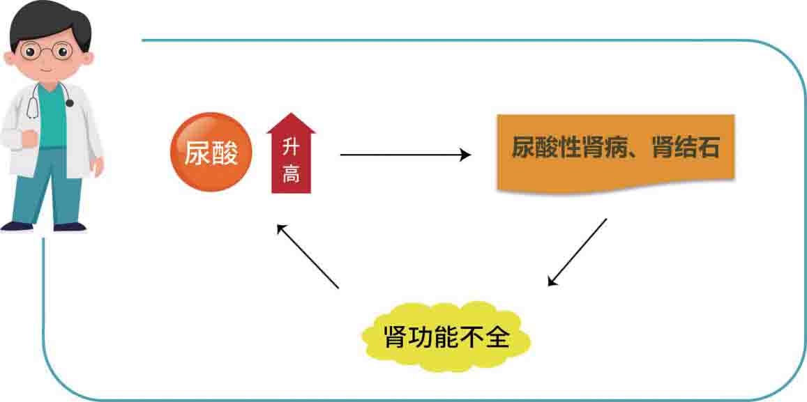一般来说,尿酸在人体内的生产量和排泄量大约是相等的。如果在人体内堆积过多的尿酸,就会造成代谢失调,出现血尿酸升高。而血尿酸水平升高又可导致尿酸性肾病、肾结石,增加发生肾功能衰竭的风险。反之,肾功能不全又是高尿酸的重要危险因素。这样,就会形成高尿酸血症与肾功能受损之间的恶性循环。