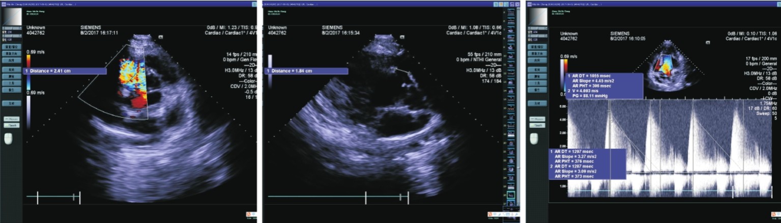 提示:左心长轴切面见室间隔回声中断,约1. 84cm,心底短轴切面见室间隔回声中断于10~11点,约2. 41cm。心尖五腔、心尖四腔均可见收缩期五彩血流束从左室经室间隔回声中断处至右室,CWD测得分流峰值V max =4. 6m/s。PWD测收缩期经肺动脉瓣峰值流速0. 94m/s。PWD测收缩期经主动脉瓣峰值流速1. 8m/s。心尖五腔切面见一股红色五彩血流舒张期从主动脉经主动脉瓣至左室流出道,主动脉瓣左室流出道侧可探及湍流频谱,流速峰值V max =4. 7m/s,DT为1297ms。