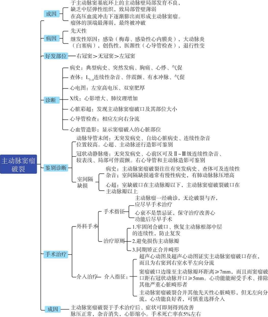 而在明确主动脉窦瘤破裂的诊断后,应积极地进行手术治疗。外科手术指征包括:主动脉窦瘤一经确诊,无论破裂与否,应尽早手术治疗;心衰不是禁忌证,保守治疗改善心功能后尽早手术。手术治疗原则:①牢固闭合破口,恢复主动脉根部中层的连续性,防止复发;②避免损伤主动脉瓣;③同期矫正合并畸形。对于部分患者,可以考虑介入治疗,但需要牢固把握介入治疗的手术指征:超声心动图证实主动脉窦瘤破口存在,而且为右窦到右室水平左向右分流;瘤体未累及主动脉瓣和瓣环,窦瘤破口边缘至主动脉瓣环距离≥7mm,而且窦瘤破口距右冠状动脉开口≥5mm;心功能耐受手术,排除其他严重心脏畸形者;RSVA合并其他先天性心脏畸形,但无右向左分流,心功能良好者可慎重选择行介入治疗。