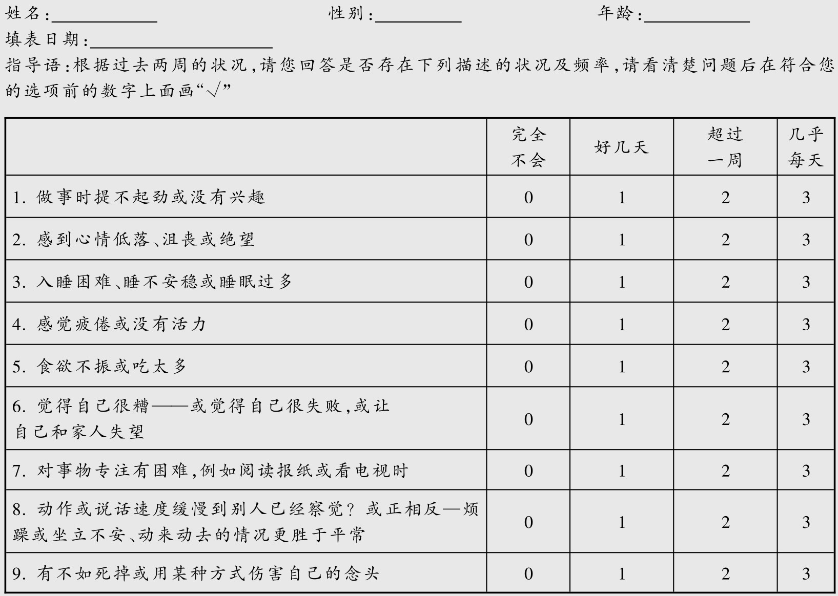 表1 抑郁症筛查量表(PHQ-9)