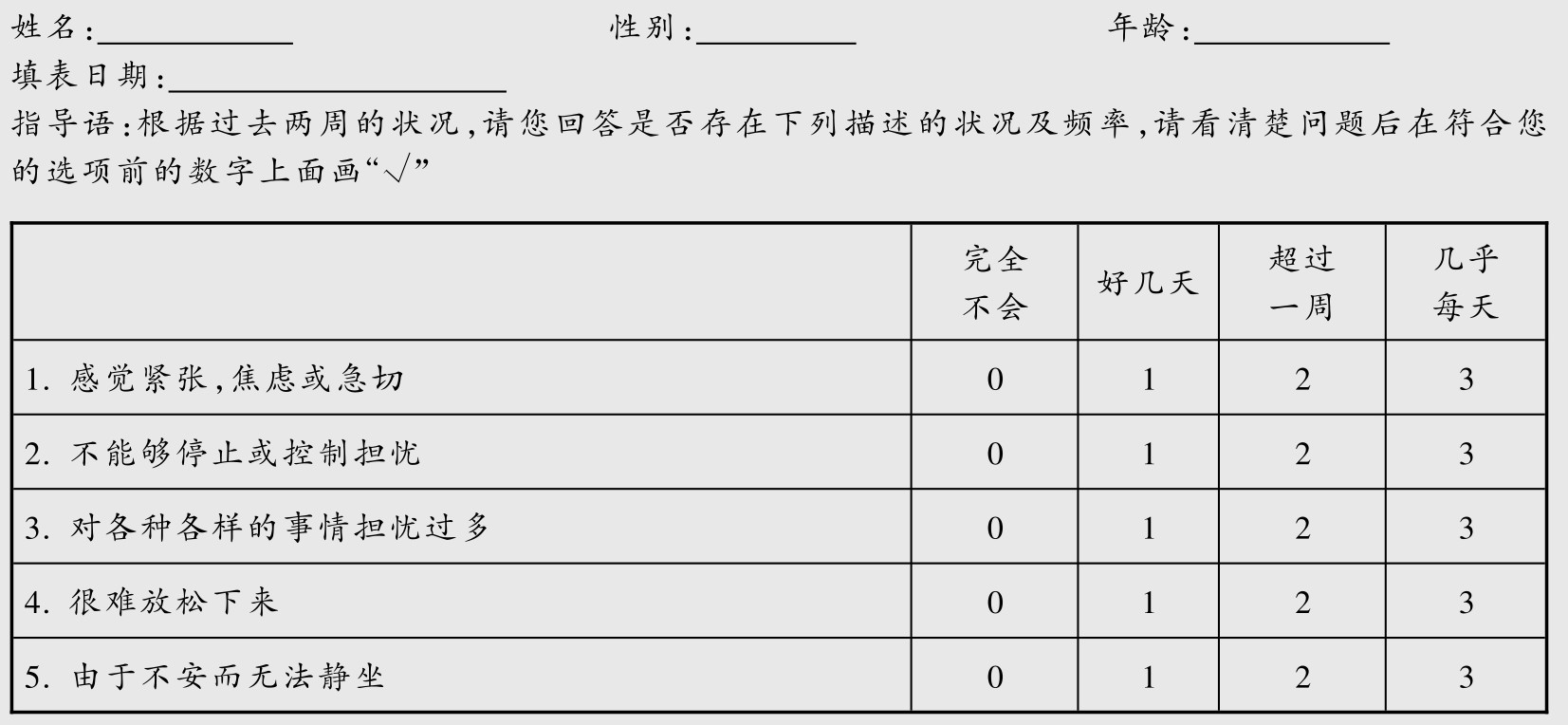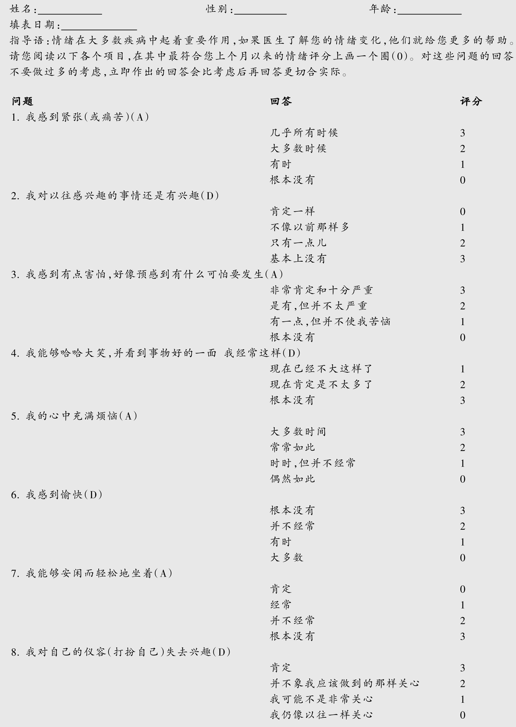 (2)评估患者的害怕、担心程度及相关内容。
