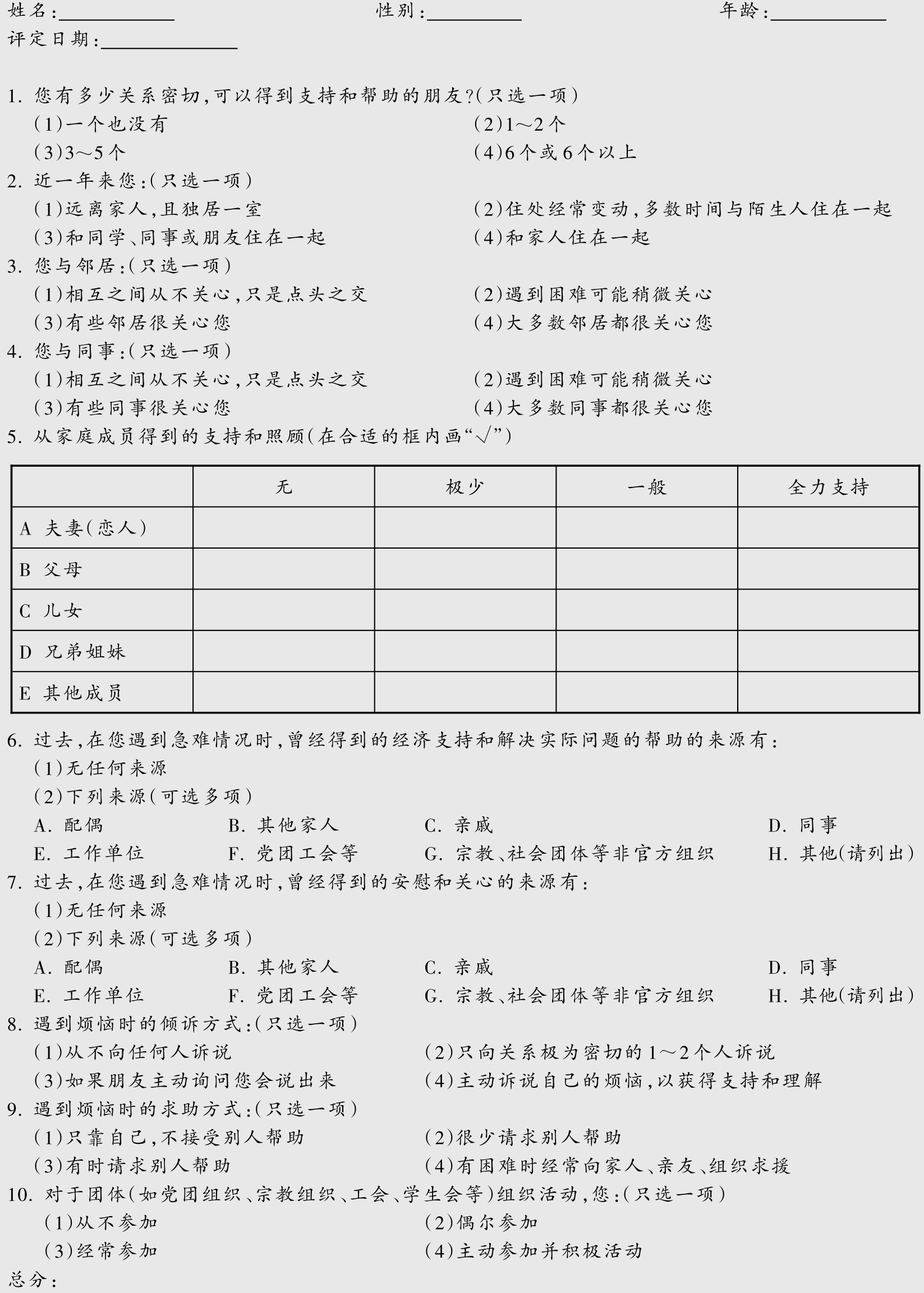 表5 社会支持评定量表