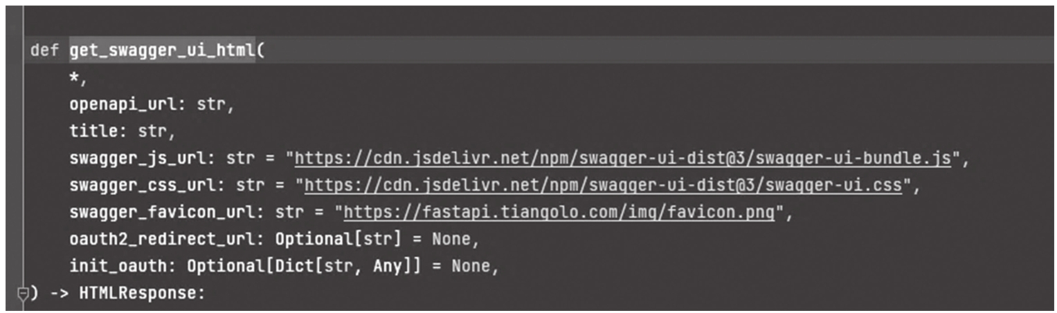 通过查阅源码可以知道,docs模板内容渲染的HTML内容位于...\FastAPI\openapi\docs.py模块中,里面有get_swagger_ui_html()方法文档,其中有HTML输出模板的内容。用户可以通过替换对应输出模板的参数实现本地资源加载,具体替换步骤如下。