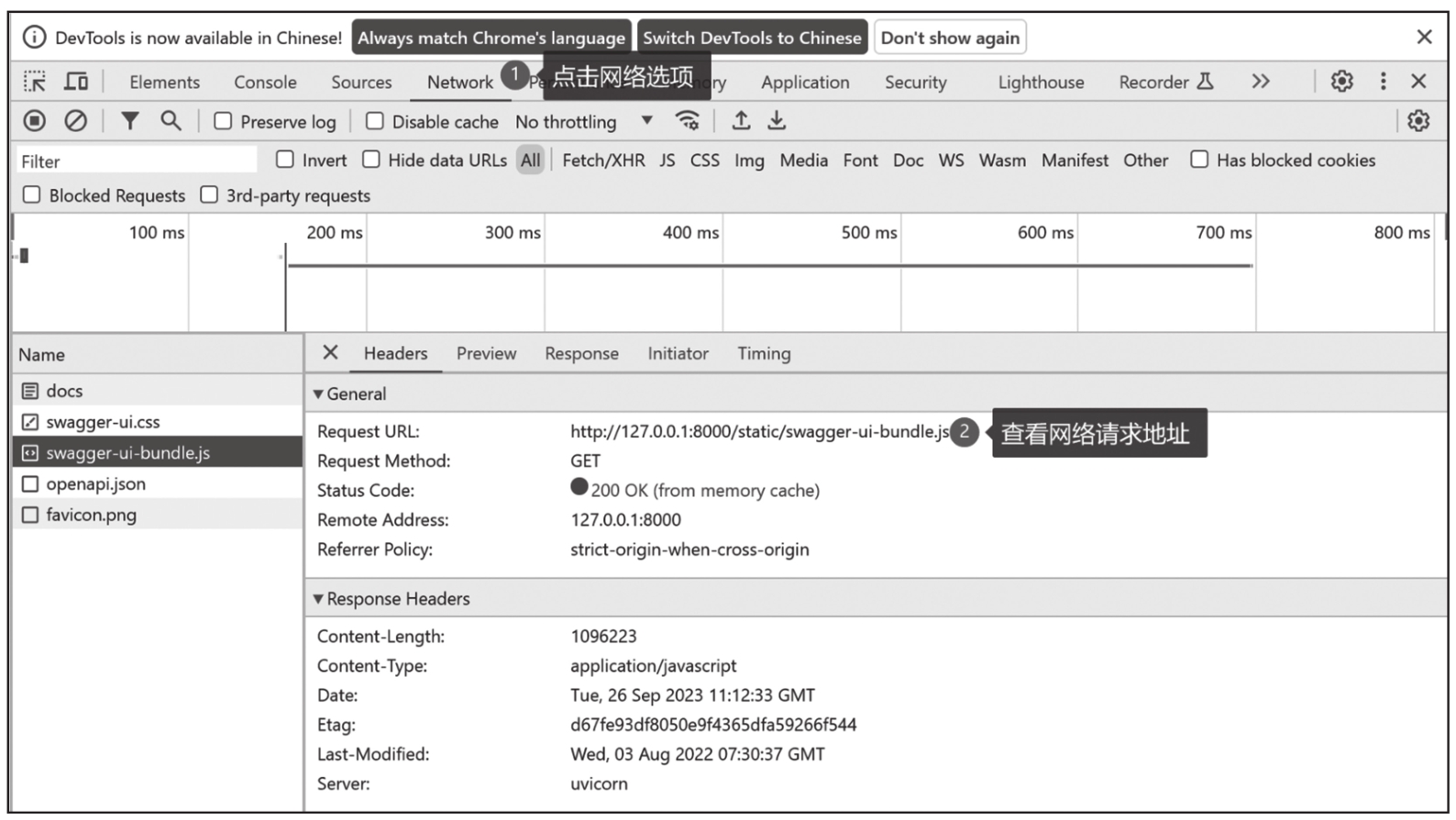 步骤4 启动服务,然后查看浏览器请求信息(打开浏览器,按下F12键),此时会发现swagger_js_url和swagger_css_url已经默认从本地加载了,如图3-10所示。