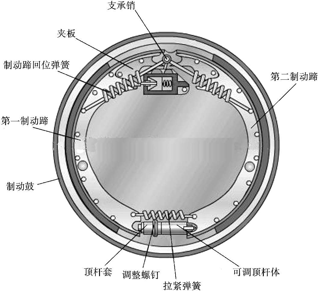 为了保持良好的制动效率,制动蹄与制动鼓之间要有一个最佳间隙值。随着摩擦衬片的磨损,制动蹄与制动鼓之间的间隙增大,需要有一个调整间隙的机构。过去的鼓式制动器间隙需要人工调整,用塞尺调整。改进之后的轿车鼓式制动器都是采用自动调整方式,摩擦衬片磨损后会自动调整与制动鼓的间隙。当间隙增大时,制动蹄推出量超过一定范围时,调整间隙机构会将调整杆(棘爪)拉到与调整齿下一个齿接合的位置,从而增加连杆的长度,使制动蹄位置改变,恢复正常间隙。
