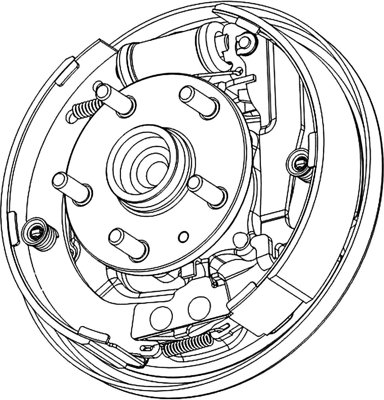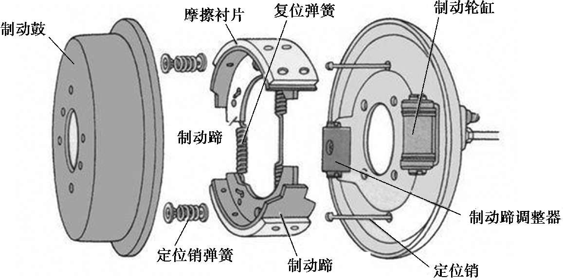 鼓式制动器是利用制动传动机构使制动蹄将制动摩擦片压紧在制动鼓内侧,从而产生制动力,根据需要使车轮减速或在最短的距离内停车,以确保行车安全,并保障汽车停放可靠、不能自动滑移。如图1-3-1所示,鼓式制动器主要由摩擦衬片、制动鼓、制动蹄、制动轮缸、复位弹簧、定位销等零部件组成。