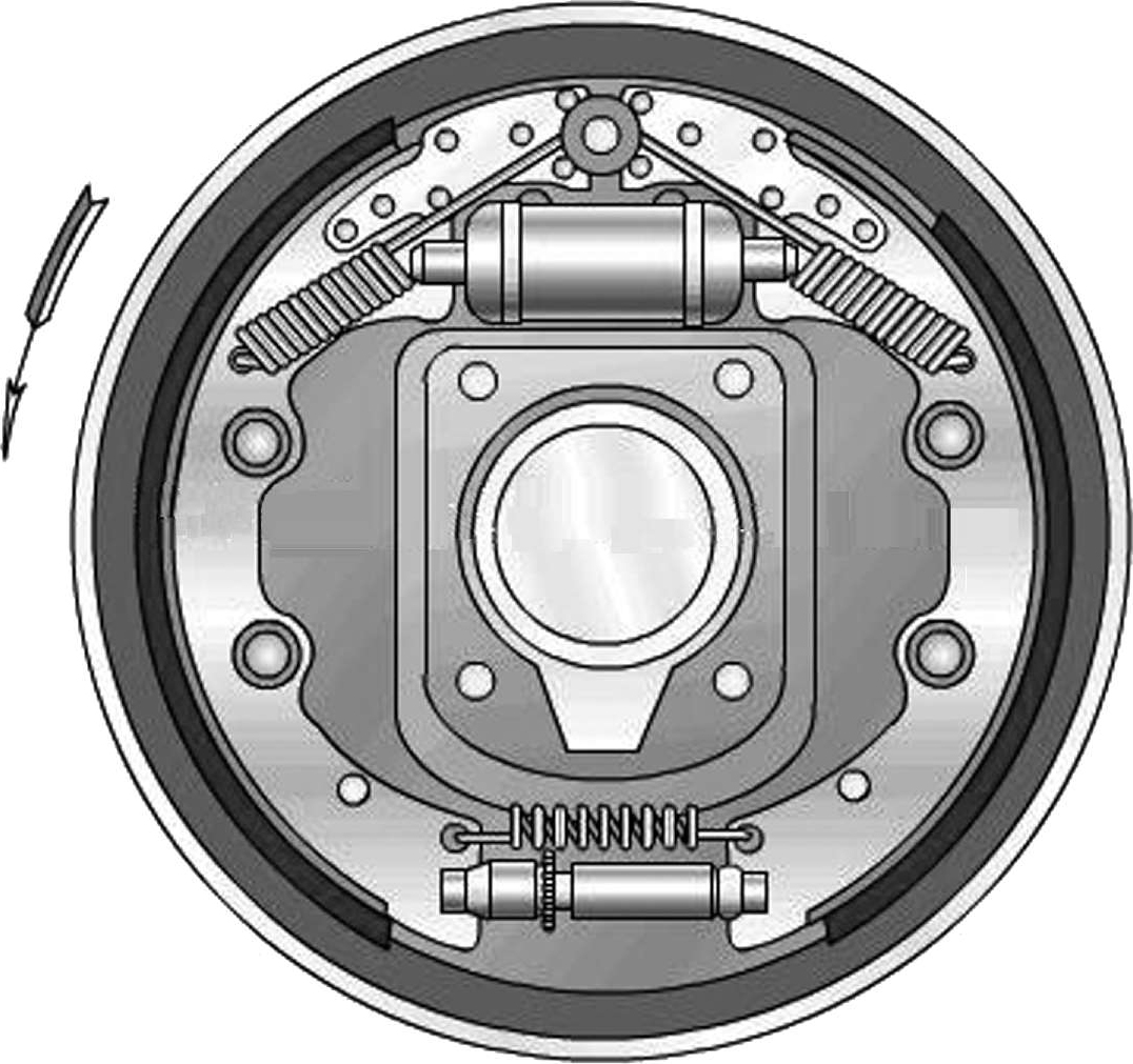 在轿车制动鼓上,一般只有一个轮缸,在制动时轮缸受到来自总泵的液力后,轮缸两端活塞会同时顶向左右制动蹄的蹄端,作用力相等。但由于车轮是旋转的,制动鼓作用于制动蹄的压力左右不对称,造成自行增力或自行减力的作用。因此,业内将自行增力的一侧制动蹄称为领蹄,自行减力的一侧制动蹄称为从蹄,领蹄的摩擦力矩是从蹄的2~2.5倍,导致两制动蹄摩擦衬片的磨损程度也不一样。