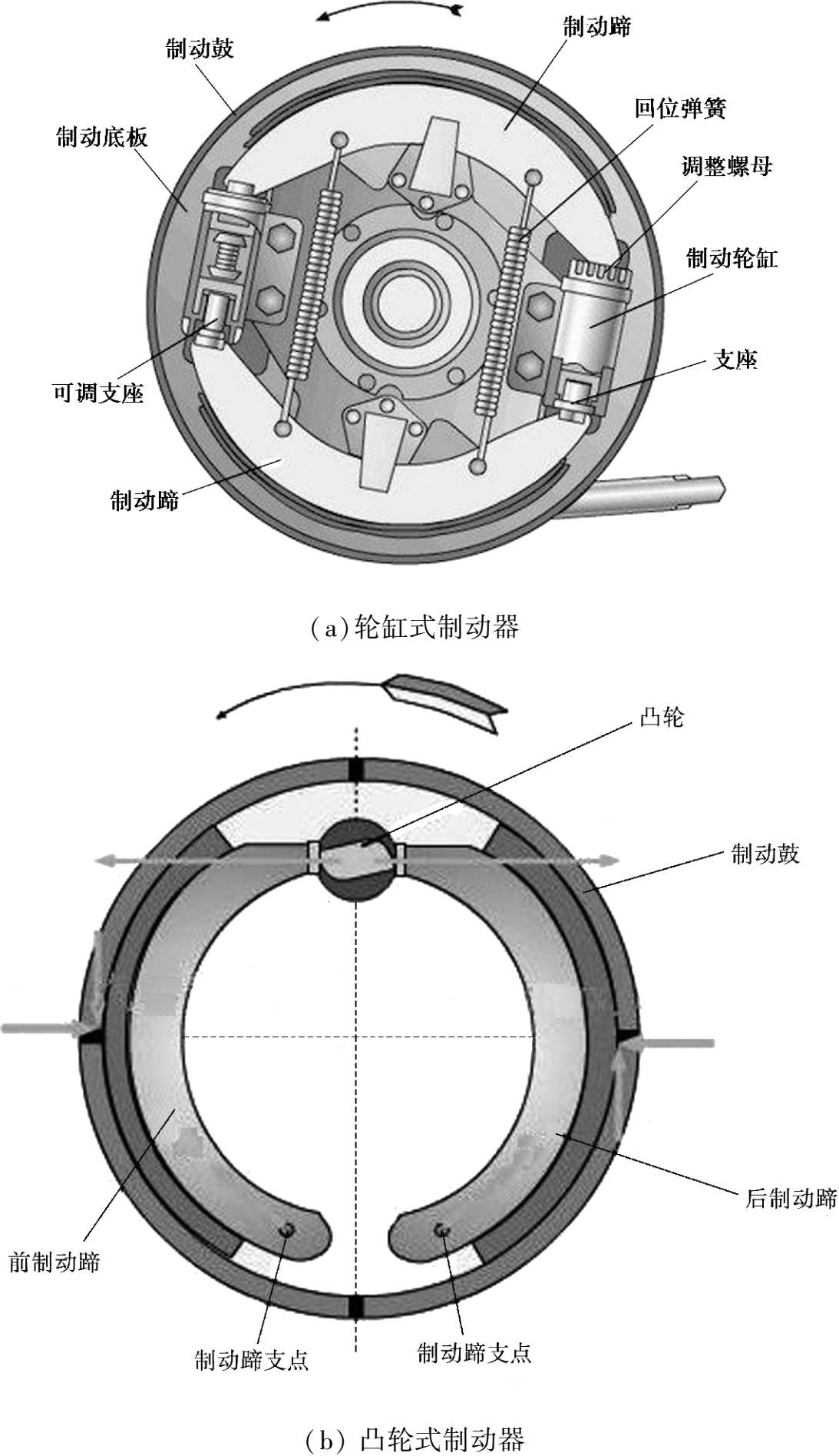 鼓式制动器根据制动蹄张开装置(也称促动装置)形式的不同,可分为轮缸式制动器和凸轮式制动器,如图1-3-6所示。轮缸式制动器以液压制动轮缸作为制动蹄促动装置,多为液压制动系统所采用;凸轮式制动器以凸轮作为促动装置,多为气压制动系统所采用。