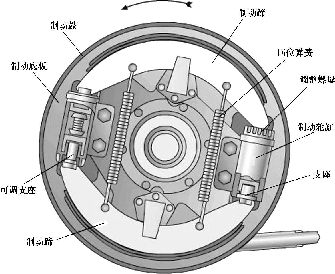 鼓式制动器是利用制动蹄片挤压制动鼓而获得制动力的,可分为内张式和外束式两种。内张鼓式制动器是以制动鼓的内圆柱面为工作表面,在现代汽车上广泛使用;外束鼓式制动器则是以制动鼓的外圆柱面为工作表面,目前只用作极少数汽车的驻车制动器。