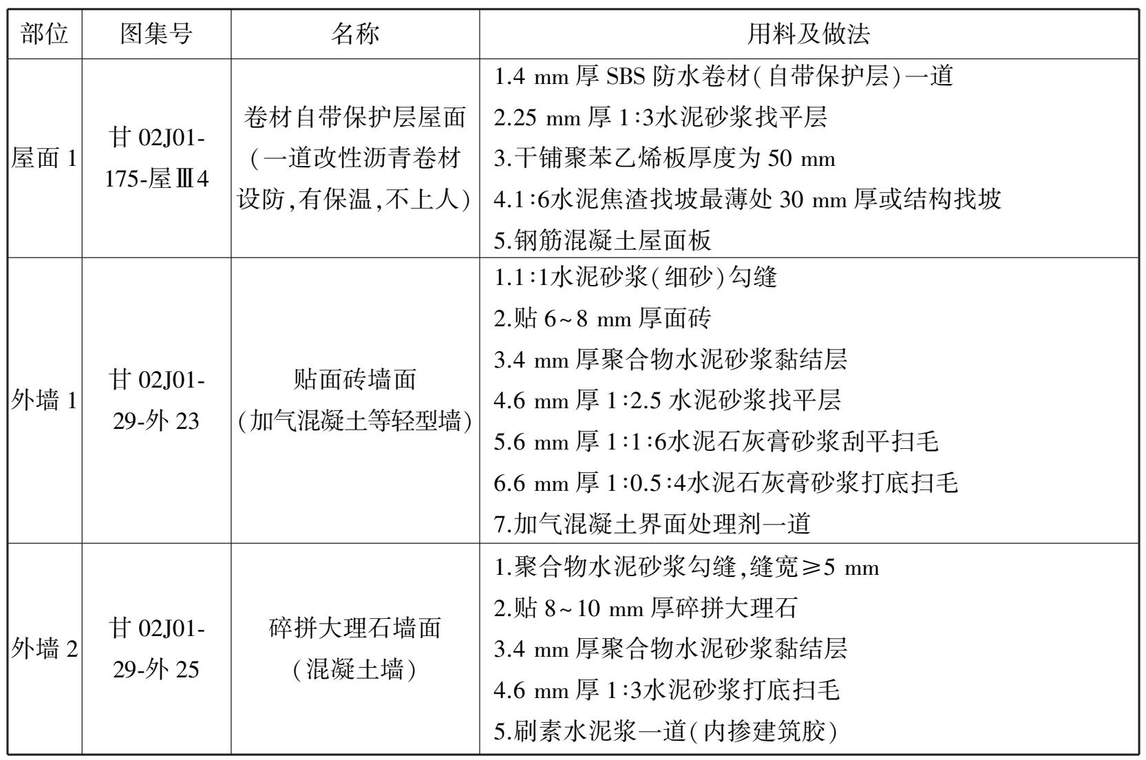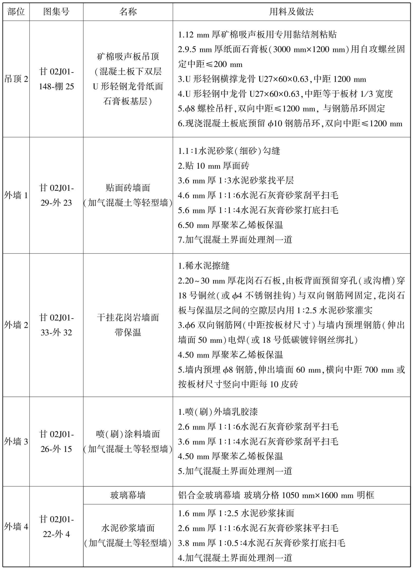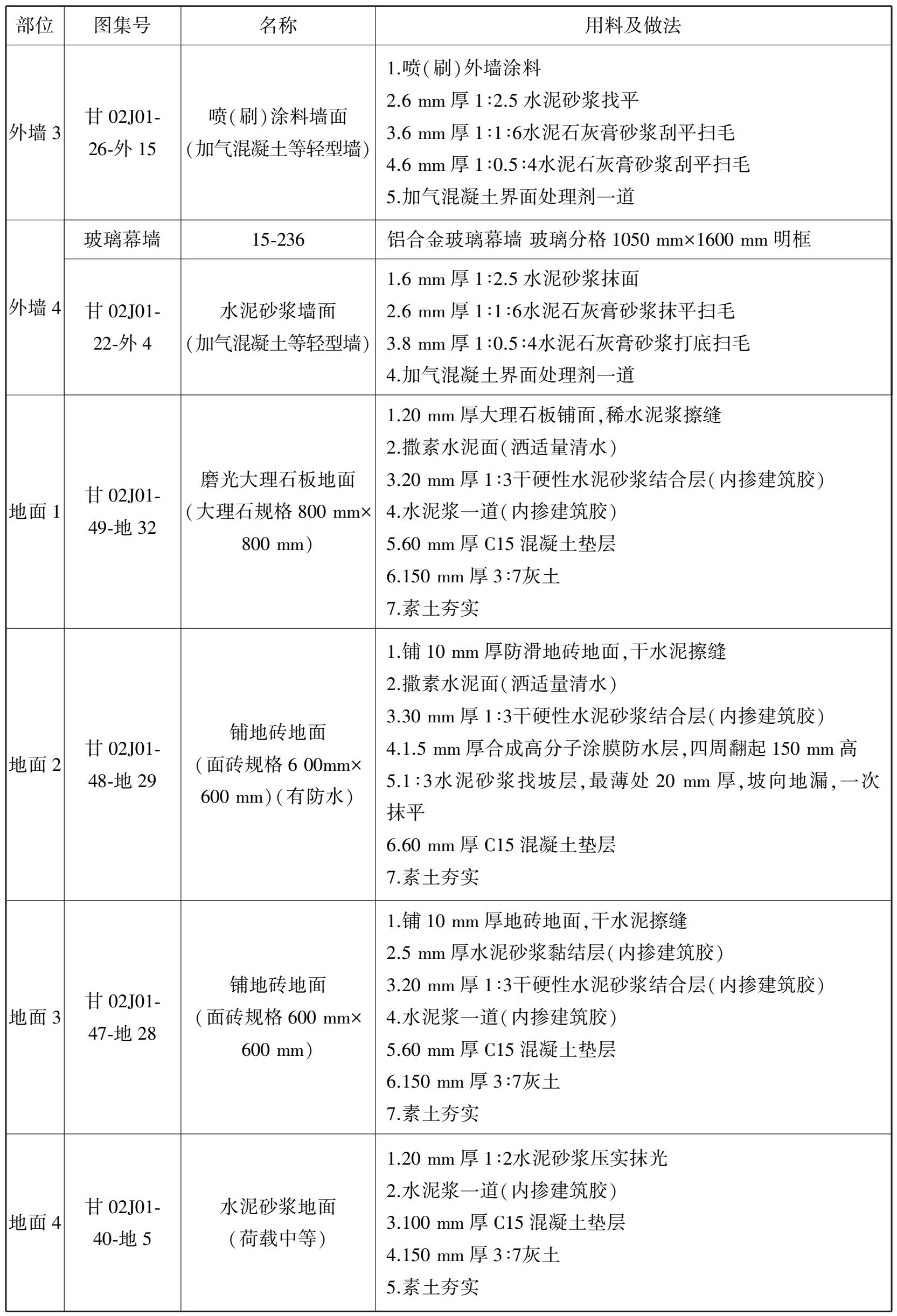 鉴于建筑装饰部分工程做法存在地域性差异,且对工程造价影响较大,现将本工程图纸设计中的工程做法部分,根据甘肃省地方标准进行修订,采用甘02J01标准图集,室外、室内装修设计工程做法内容见表1.1。