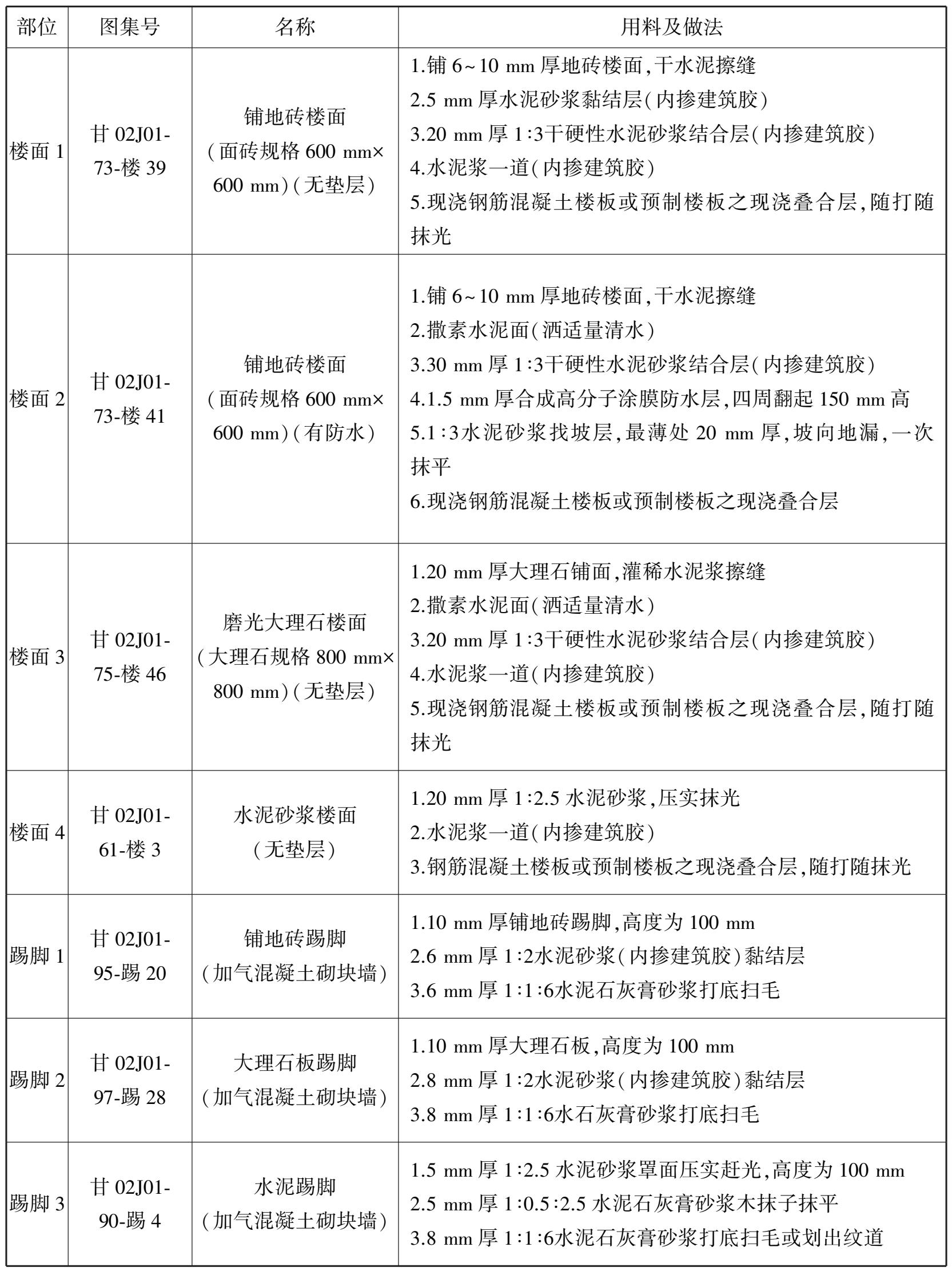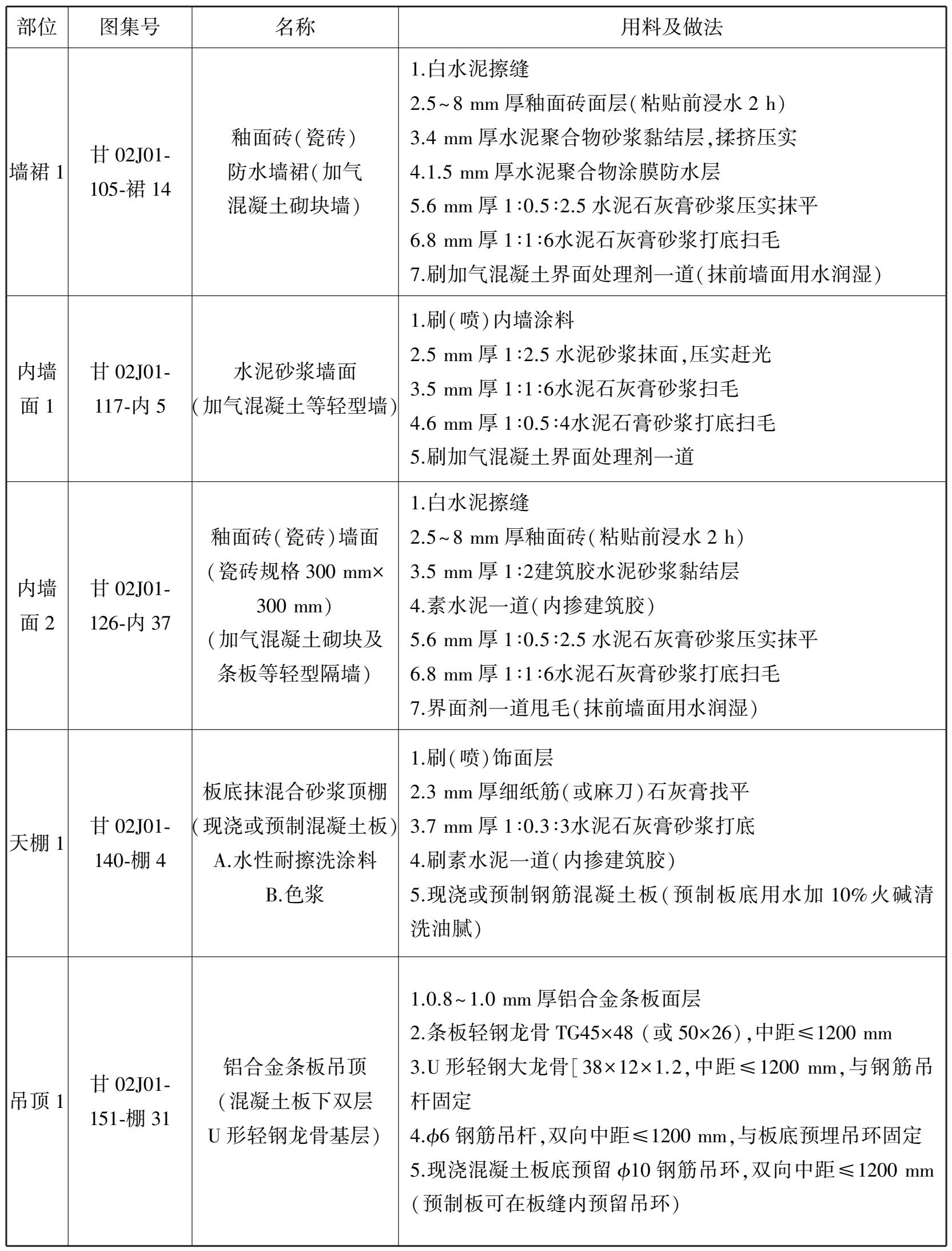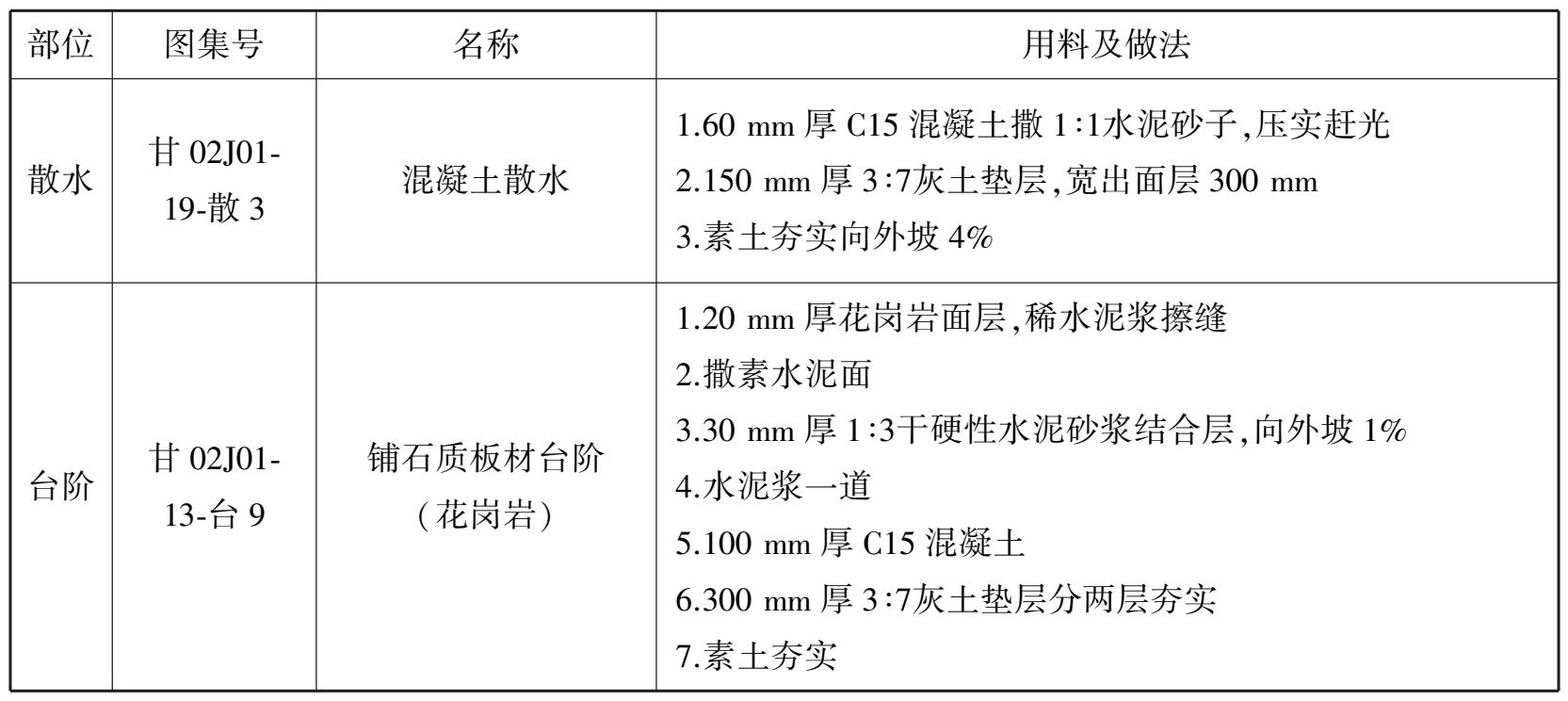鉴于建筑装饰部分工程做法存在地域性差异,且对工程造价影响较大,现将本工程图纸设计中的工程做法部分,根据甘肃省地方标准进行修订,采用甘02J01标准图集,室外、室内装修设计工程做法内容见表1.1。