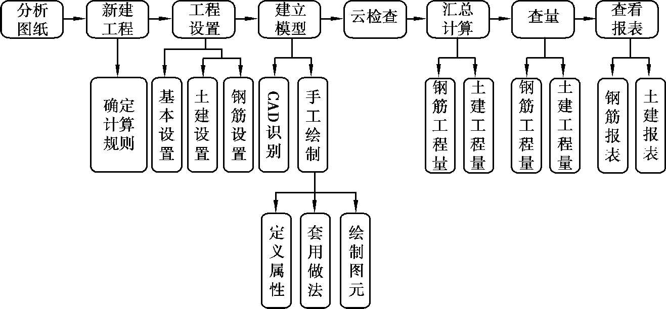 在进行实际工程的绘制和计算时,GTJ相对以往的GCL与GGJ来说,在操作上有很多相同的地方,但在流程上更加有逻辑性,也更简便,大体流程如图1.3所示。