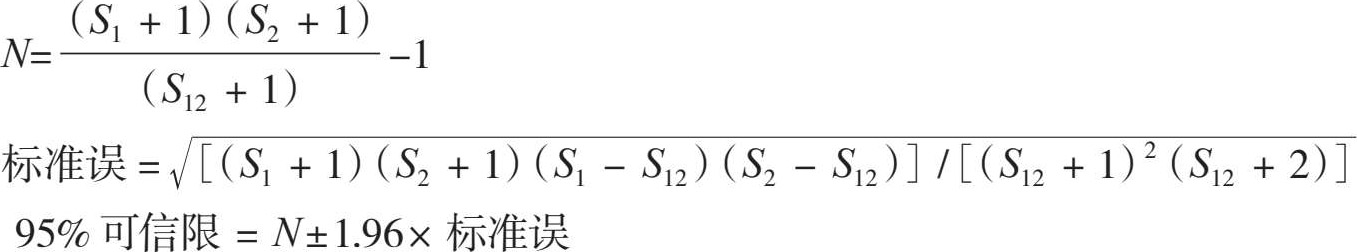 公式里, S 1 可看作是用一种方法收集到的病例数, S 2 为另一种方法收集到的病例数, S 12 为两个名单中均有相同病例的人数, N 为总病例估计数。用总病例估计数除以相应的高危人数,即可算得总估校正患病率(查出率)。