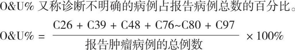 2. 原发部位不详或未特指的病例所占百分比(O&U%),以及年龄不明所占百分比。肿瘤登记资料的准确性不仅受错误资料的影响,而且受遗漏资料的影响。医院总会有一些记录为“不详”的项目。对于必需的/基本的项目,不详的百分比应当尽可能接近“0”。监测遗漏信息常用的两个指标为原发部位不详或未特指的病例占登记病例的百分比,以及年龄不明所占的百分比。