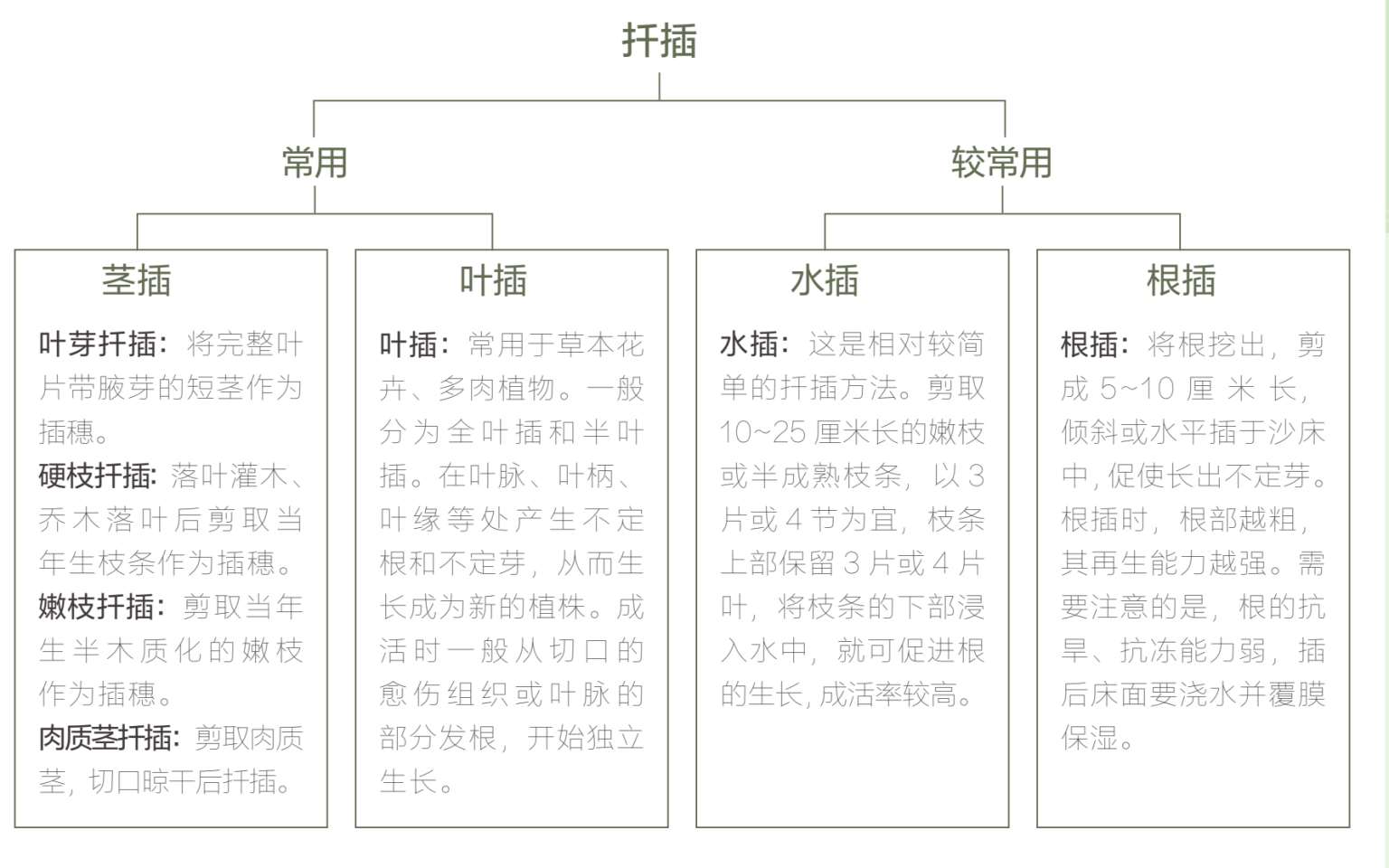扦插是利用植物的营养器官具有再生能力的原理,从母株上切下一部分,如根、茎、叶,插入基质中,使之生根,然后生长成为一个完整植株的繁殖方法。扦插一般分为生长期扦插和休眠期扦插。