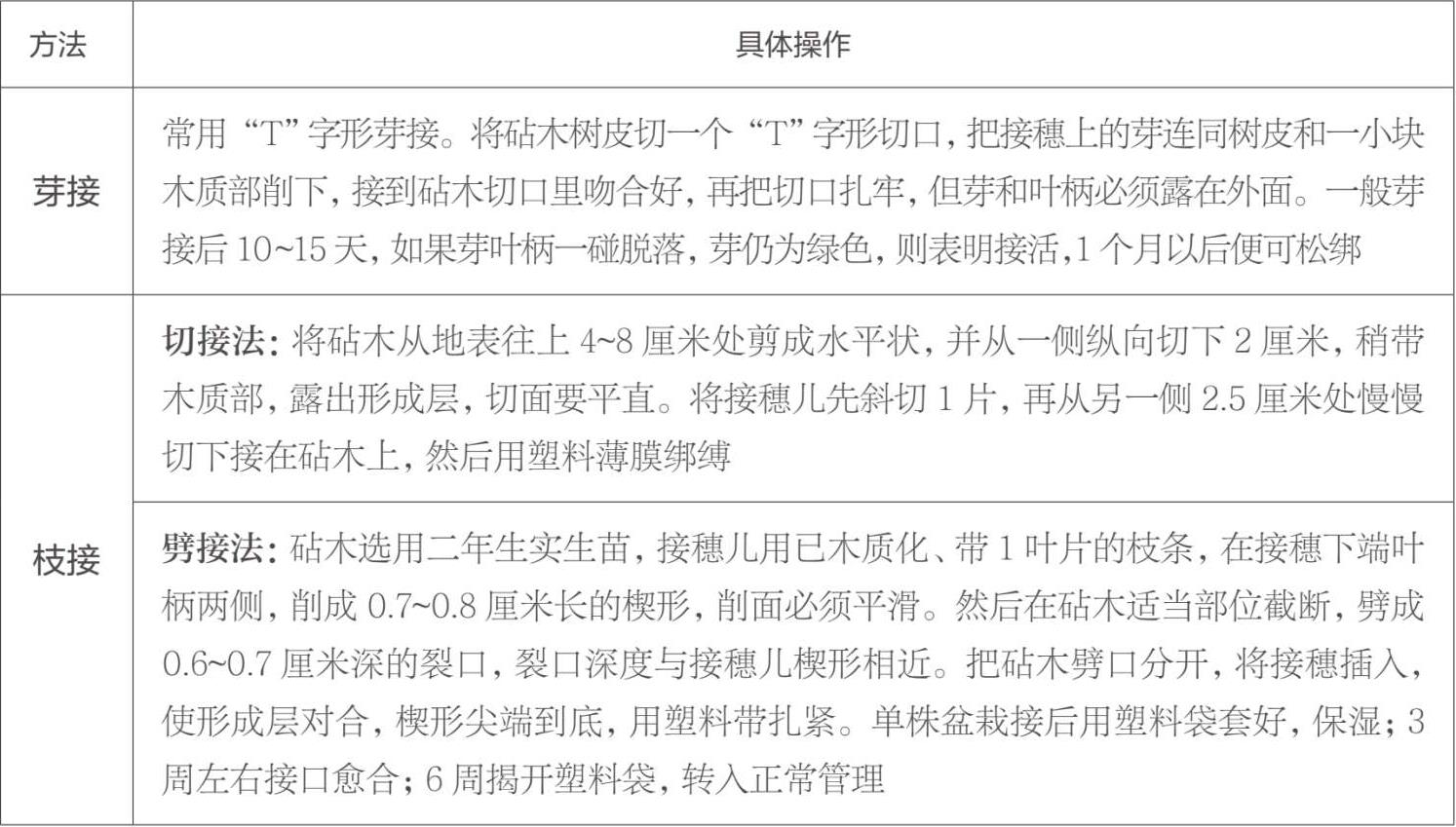 嫁接分为芽接和枝接。而芽接又有“丁”字形芽接、嵌芽接、套芽接等,枝接又有切接、劈接、腹接等。