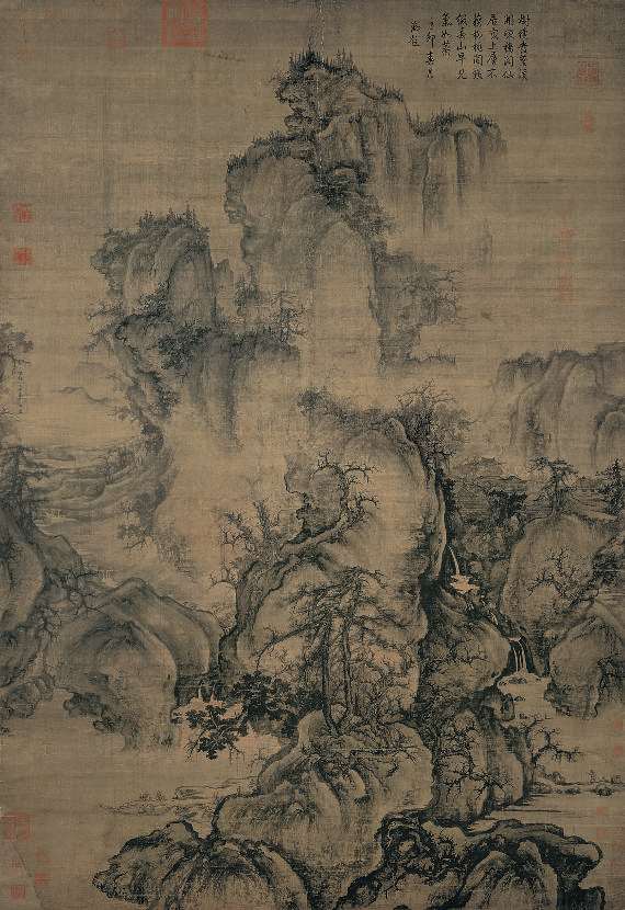 郭熙的《早春图》(1072,图 1.24)呈高远式构图。山石树木浸淫在亦幻亦真的画面之中:雾锁青峰、树石若隐、水气氤氲。郭熙的笔墨曲尽其妙、丰富灵动,他写道:“用浓墨、焦墨欲特然取其限界……故而了然,然后用青墨水重叠过之,即墨色分明,常如雾露中出也。”