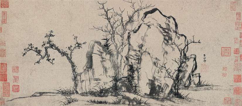 在《秀石疏林图》(约 1300,图 1.25)的题跋中,阐明了他在作画时是如何融合了书法诸笔法的: