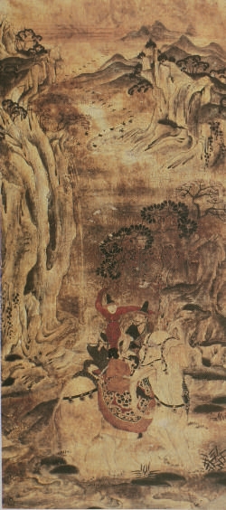 纵立构图的《山底清坐图》(图 1.21)以“高远”视角刻画出山峰凌霄、巨崖壁立的情景。《隼鸭图》(图 1.22)的“平远”构图表现的是峦峰起伏、渐次退隐的通景风貌。而《猎虎图》(图 1.23)的“深远”构图则引领观者视线在丘壑峡谷间穿越。这种“三远”式构图法也同样适用于横幅式的山水长卷。 [9]