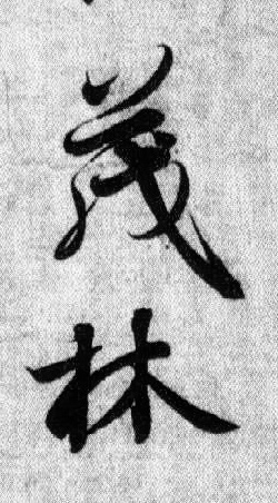 其实,书法中的“转”法有二种表现形式: 一种是字内之转折,有象可睹;一种是字外之使转,无迹可循。字外之使转又有虚实二种: 牵丝为有形之使转;使转是无形之牵丝。有形之使转用的是一种虚中见实的力,无形之牵丝用的是一种纯属虚无的力,虽不著纸,却极要留意。试观中的“茂”字(图 2-5),在点画交换转折的过程中,空中打圈,笔势显得十分圆活。王虚舟《论书剩语》曰: