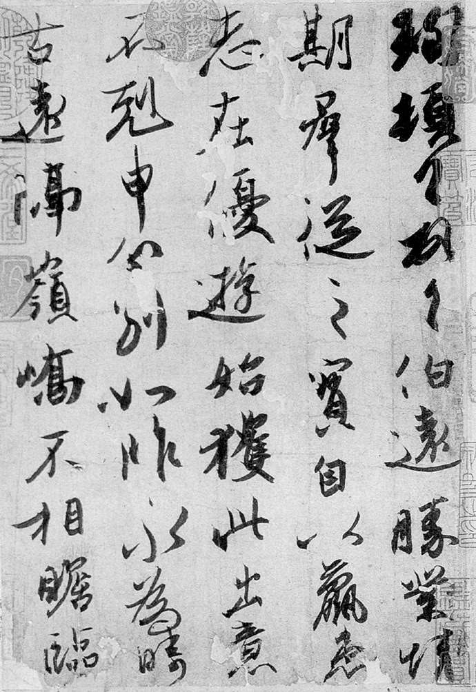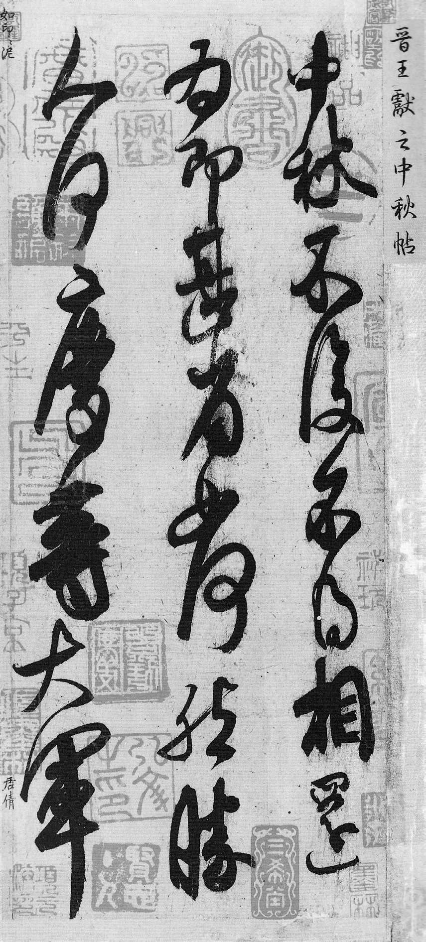 可惜此帖已失传,从他流传下来的《中秋帖》(摹本墨迹)来看,其书一笔环转,中藏点画,悉具起伏顿挫之势,且笔力雄健,淋漓酣畅,如神龙游天,给人以变化莫测之感(图 2-10)。