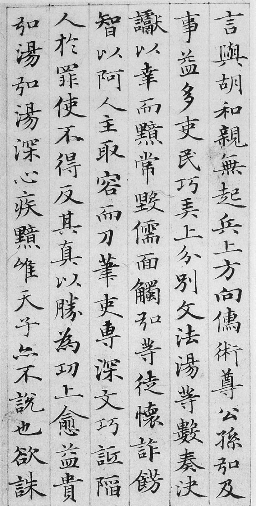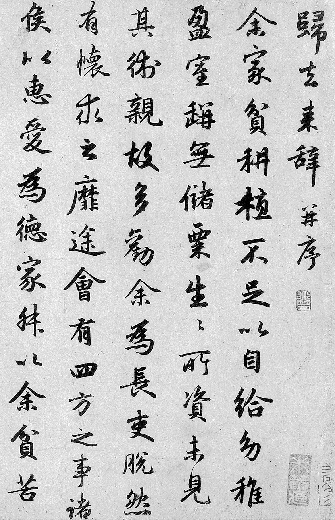 体势平正,行气流畅,这是一种很高级的,富有理性美的取势方法。颜真卿、赵孟頫、文徵明等书家的行书都善用此法(图 2-14)。这种取势方法弄得不好,最容易板,因此特别要注意到一行中大小、长短、开合、伸缩、俯仰、向背的变化,力求通过参差的节奏和生动的笔法来弥补体势平正的不足。特别是用笔,不可僵硬,贵势从内出,如此则能于平正通达之中,有变化迷离之妙。