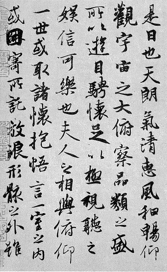 纵观历代行书家他们的取势手法虽各不相同,但我们可以通过以形求势的方法摸索到其中的内部规律,唯独只有一个人,那就是王羲之,简直是不可端倪,令人至今尚疑惑不解。他那神妙莫测的变化,风神盖代的体势,几乎没有一点习气,实令人惊叹不已。同样一个字,在不同的场合采用不同的结法,处理得是如此的妥帖,既合乎情理,又出于自然,如天成铸就,真不愧为“书圣”。特别是他的签字,“羲之”二字,不仅无有同者,且无一不熨帖,无一不漂亮。在《淳化阁帖》和《十七帖》中,“足下”、“慰”等字用得最多,无一雷同,令人于心底里暗暗地佩服他,却无法窥破他用笔体势的微妙,无怪乎前人有“世人但学兰亭面,欲换凡骨无金丹”之叹。正如黄庭坚《山谷题跋》所谓:“右军笔法如孟子言性、庄周谈自然,纵说横说,无不如意。”这是一种从心所欲不逾矩的境界。