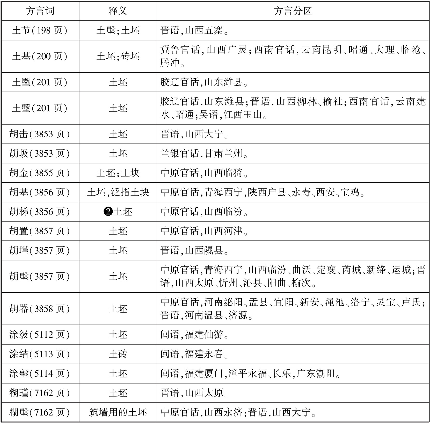 从方言分区看,“胡墼”一致性地分布在北方方言区,以中原官话、晋语、兰银官话为主。“土墼”南北均有分布,“涂墼”则以闽语为主。细辨之,“胡墼”更强调土坯之大(详见下文)。“土墼”则更强调其泥作,如宋陈师道《后山谈丛》卷二:“唐末,岐、梁争长,东院主者知其将乱,日以菽粟与泥为土墼,附墙而墁之,增其屋木,一院笑以为狂。”