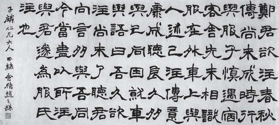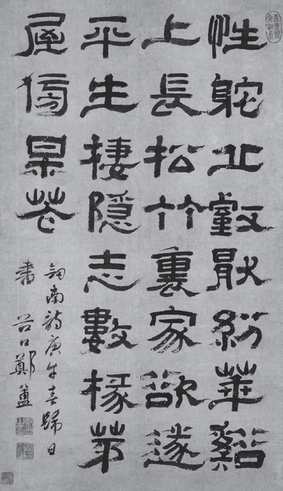 清朝隶书艺术的复兴源于这样两个条件:一是科举制度下产生的馆阁体为文人士大夫所痛恶。这种墨乌黑、字方整、笔光润的楷书字体,往往被认为算不上是书法艺术,所以莘莘学子一待博取功名,取得官职禄位,就将馆阁体抛弃,开始追求自己所确认的书法艺术进行创作,于是能各适其所地写出各自的书法风格。二是金石出土日益增多,文人士大夫的眼界不断开阔,由于碑学的崛起,篆隶字体越来越受到世人所重,书法家纷纷学习汉碑。也正因为具备了上述两个条件,促成了隶书艺术在清一代的枯木逢春、百花齐放,使清代隶书艺术成就超越唐宋,成为继汉隶后的又一高峰。于是朝野掀起了学习汉碑的高潮,隶书重新被文人墨客所重视,擅长隶书的书家越来越多,可谓人才辈出。金农的漆书,以拙为妍,以重为巧,高古稚拙,使人肃然(图1-23);郑簠的隶书参以草法笔意,古拙沉着,奇绝飞动(图1-24);伊秉绶变化出新,在秀逸古媚中金石之气溢于翰墨(图1-25);何绍基集功力、学养、才气于一身,其隶书有超神入化之妙;赵之谦隶书以魏碑笔法入隶,既生动又古拙,尽得天真烂漫之趣(图1-26)。清代人写隶书可谓人才济济,其功力精深,取法高远,“直逼汉人”,恢复了中断近一千五百年的汉隶法度,并在此基础上不断创新发展,使当时的审美趣味发生了重大的转变,可谓百花争艳,万紫千红。清代隶书的复兴,也为清代碑学的兴起起到了引领作用,从而改变了帖学垄断书坛的局面,帖、碑并驾齐驱,不但如此,还有碑学压倒帖学的趋势,其中,汉碑是起到关键性作用的。可以说隶书为碑学开了先河,并贯穿始终。由此可见,隶书在清代的复兴,在实质上改变了书法艺术的发展道路,成为碑、帖互重互动的历史转折点。