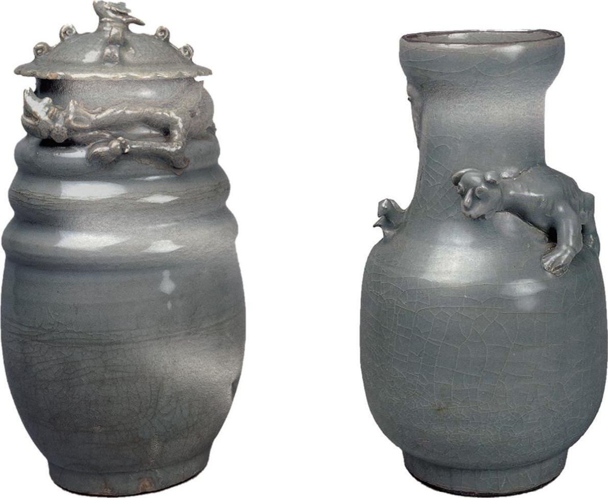 浙南处州龙泉、庆元等县,北宋中晚期多随葬五管瓶,南宋多随葬成对的龙虎瓶;婺州武义、永康、金华县与衢州龙游等地常见随葬堆塑瓶(图1-21、图1-22、图1-23)。龙虎瓶,恐怕是受江西、闽北地区民间丧葬文化影响的结果,使用者多为当地的富裕平民(图1-24)