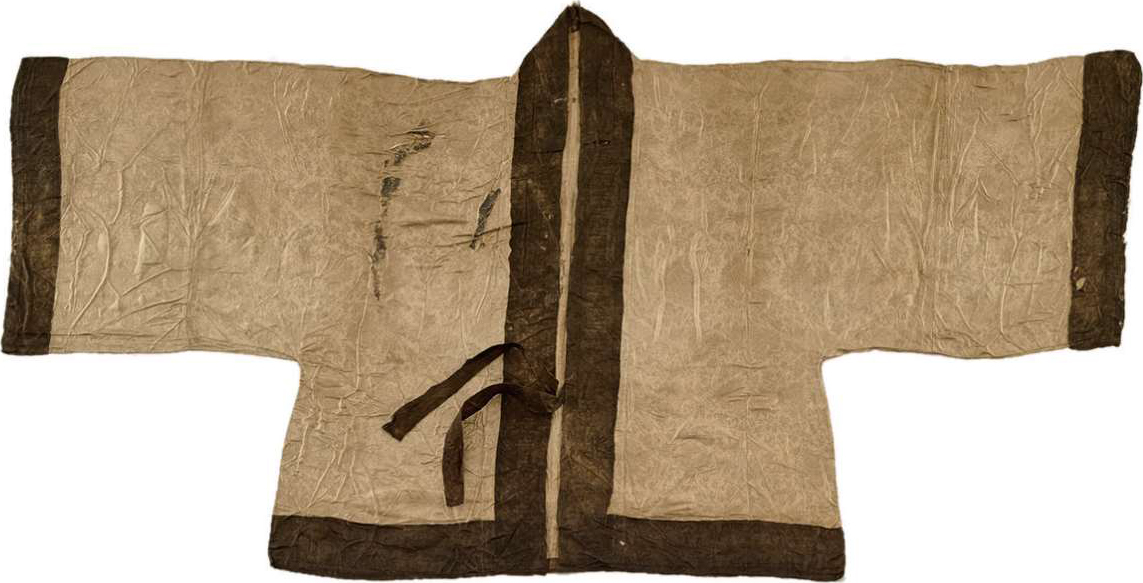 赵伯澐系宋太祖七世孙,南宋初,其父赵子英徙居台州黄岩,遂为邑人。赵伯澐生于绍兴二十五年(1155),卒于嘉定九年(1216),赠通议大夫。其墓保存完好,入殓时上身、下身各着八重衣物,尸骸与棺木之间塞满衣物,有衣、裤、袜、鞋、靴、饰品等,其中衣有圆领衫、对襟衫、交领衫、抹胸等(图1-17),裤有合裆裤、开裆裤、胫衣、裙裤等;饰品有帽、腰带等,织品包括绢、罗、纱、縠、绫、刺绣等,将棺木充塞紧实,正如《朱子家礼·丧礼》“大敛”所称,“共举尸纳于棺中,……又揣其空缺处,卷衣塞之,务令充实,不可摇动”。另有随身的玉璧、水晶璧挂件和一面带柄铜镜等随葬品。玉璧系南唐皇帝李昪投龙玉璧(图1-18),铭曰:“大唐皇帝昪谨于东都内庭修金箓道场,设醮谢土,上仰玄泽,修斋事毕,谨以金龙玉璧,投诣西山洞府。昇元四年(940)十月日告闻。”(图1-19)此件南唐玉璧在传世近300年后,作为赵伯澐生前雅玩得以随葬