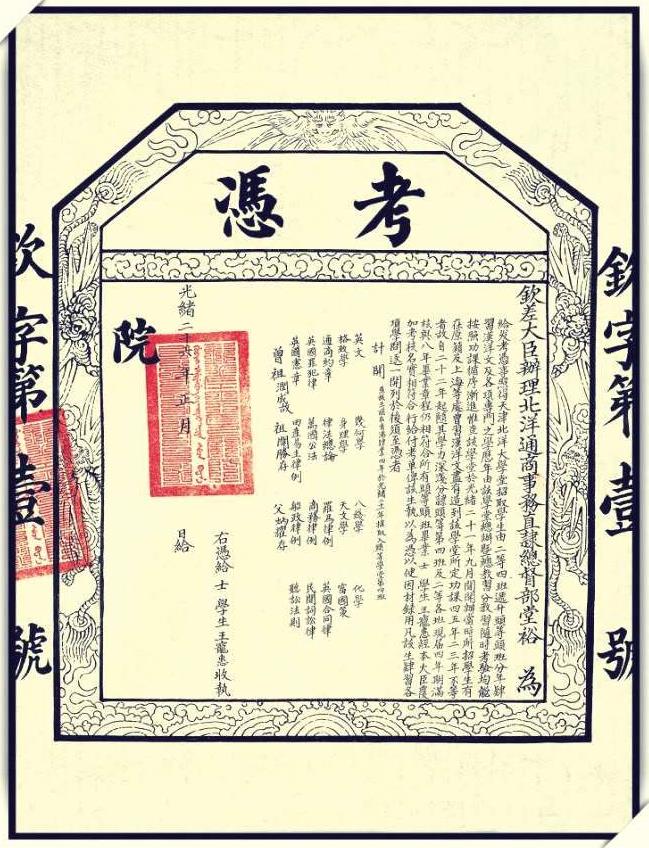 清光绪二十六年(1900)年初,首届学生毕业,直隶总督裕禄为一名叫王宠惠的学生颁发“钦字第壹号考凭”,这是中国第一张大学文凭。王宠惠祖籍广东东莞,出生在香港,幼时学习英文、国学,考入北洋大学堂法律科,学习英文、几何、化学、天文、富国论、法律通论、罗马律例、英国合同论、英国罪犯律、万国公法、商务律例等课程。毕业后他先到上海南洋公学任教,又到美国加利福尼亚大学、耶鲁大学留学,取得民法学博士学位。辛亥革命后回国出任司法总长、大理院院长,后来当选为国际仲裁法庭裁判员,出任海牙国际法庭法官。
