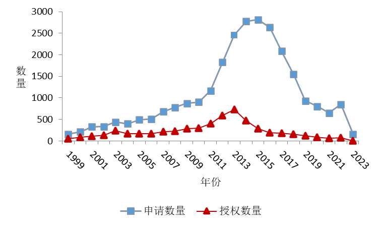 以关键词黄连、云连、雅连、味连、鸡爪莲以及黄连的拉丁名和英文名Rhizoma Coptidis、Coptis chinensis进行检索,排除胡黄连及岩黄连所带来的噪音影响,对检索结果进行简单同族合并去除重复专利文献,时间限定为2023年12月31日之前,选取的专利申请为黄连单味药或包含黄连的中药组合物,或与黄连及先关产品生产加工有关的装置及设备,共检索到专利申请26820件,其中中国25605件(含中国台湾49件),国外1215件。为便于分析,对相应检索结果的统计分析时间从1999年01月01日起算,期间申请和授权的黄连相关专利其申请量随时间的分布如下图2-2-2所示。
