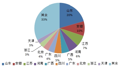 由图2-2-7至图2-2-9可以看出,黄连领域专利申请量和授权量最多的是山东,专利申请数量占比20%,授权数量占比22%。就专利申请量而言,排名次于山东的省市依次是安徽、江苏、河南、广西、四川、广东、北京等,四川排名第六。就专利授权量而言,排名仅次于山东的省市依次是河南、安徽、北京、四川、广东、江苏等,四川排名第五。对于四川地区的申请量和授权量排名,尽管四川属于黄连的道地产区,但黄连在我国其他地区也有大量种植和研究,这些地方出产的黄连及相关产品会与川产黄连及相关产品形成激烈的竞争关系。同时也说明,随着中医药现代化进程的逐步推进,黄连的药用价值不断被挖掘,越来越多的人发现了黄连蕴藏的药用价值,因此,对于黄连的研究和开发在全国范围内呈现出各地区同时进行的局面。由于黄连在心脑血管疾病和消化道疾病方面展现出来的治疗优势,对于黄连的研究与开发依然会成为未来的发展重点,其专利申请数量和质量也会持续保持好的发展势头。
