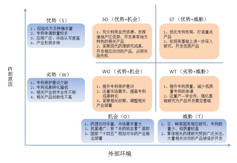 黄连专利开发现状SWOT分析具体见图2-2-14。