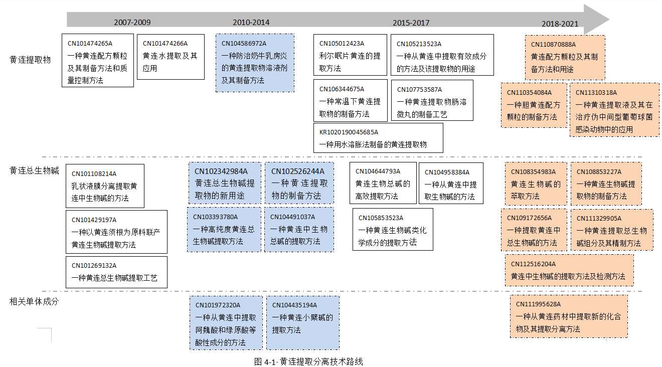 目前,对于中药材相关有效成分的研究已成为中药现代化研究的热点之一,对于黄连而言,黄连相关药效成分的提取分离研究对黄连的临床研究和进一步探索黄连的药理作用具有十分重要的意义。黄连的提取分离技术相关专利主要涉及黄连提取物提取、黄连总生物碱提取以及黄连单一成分提取分离等方面。现从不同分支对黄连的提取分离技术相关专利进行总结。