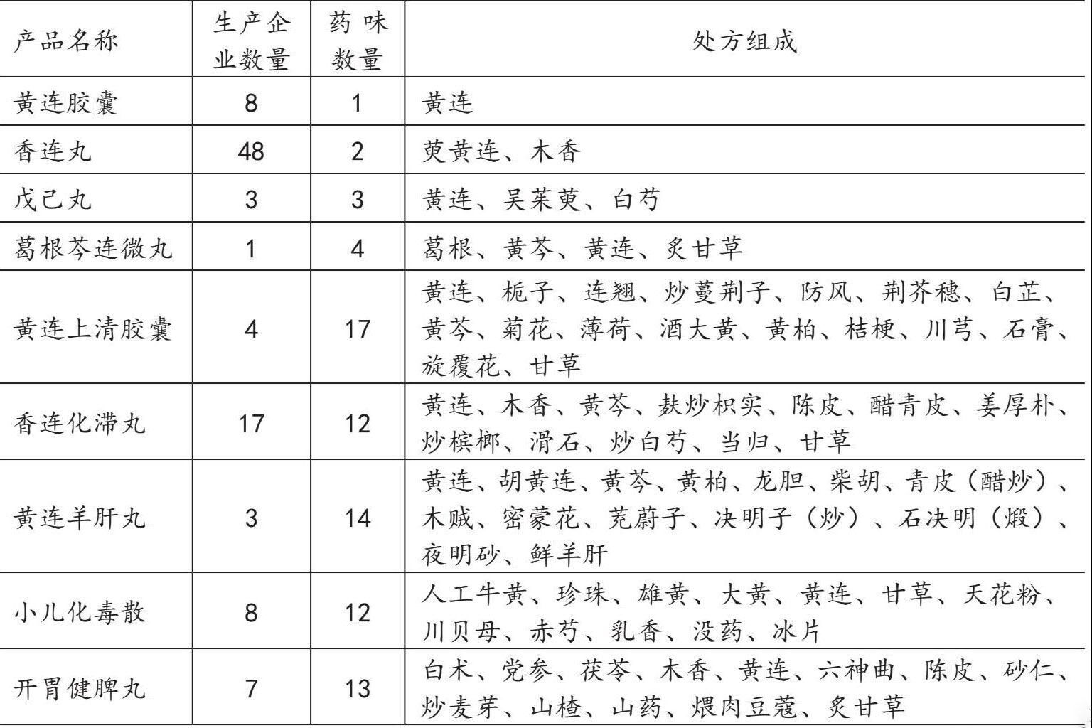 分析含黄连的中成药处方组成,结果显示,大复方占比较高,其中组方药味10味以内的共计46种,占比46.37%,11味-20味共计62种,占比62.50%,21味-30味共计9种,占比9.7%,组方药味数量大于30味共计7种,占比7.6%。本文将以黄连为主要原料的部分中成药产品罗列如下: